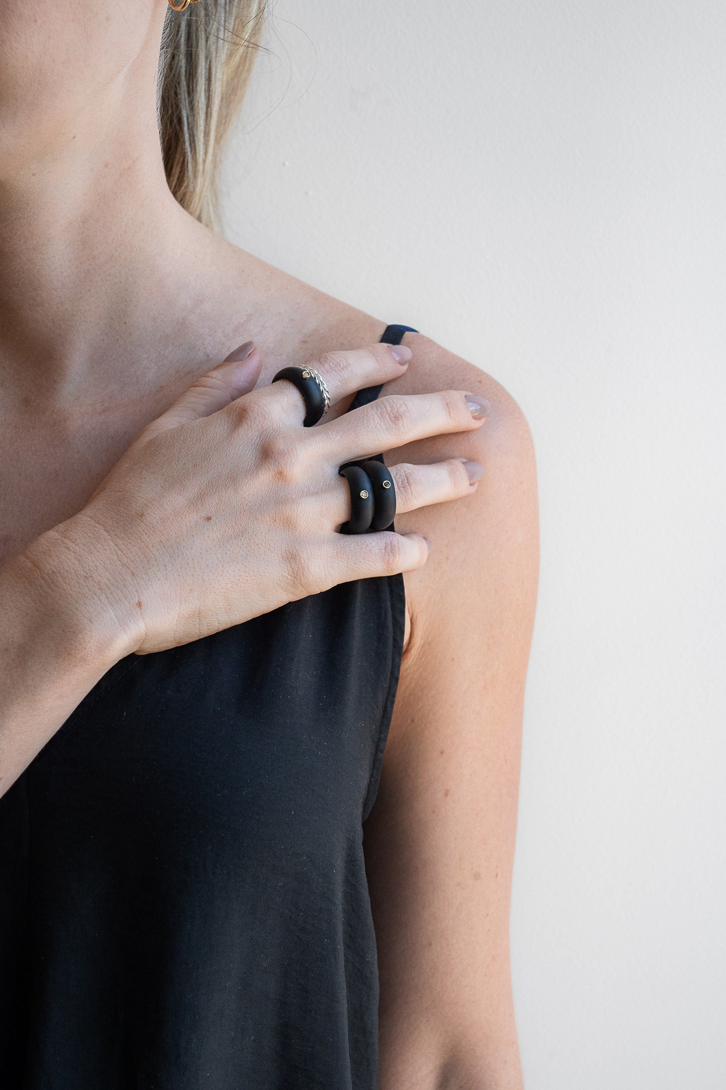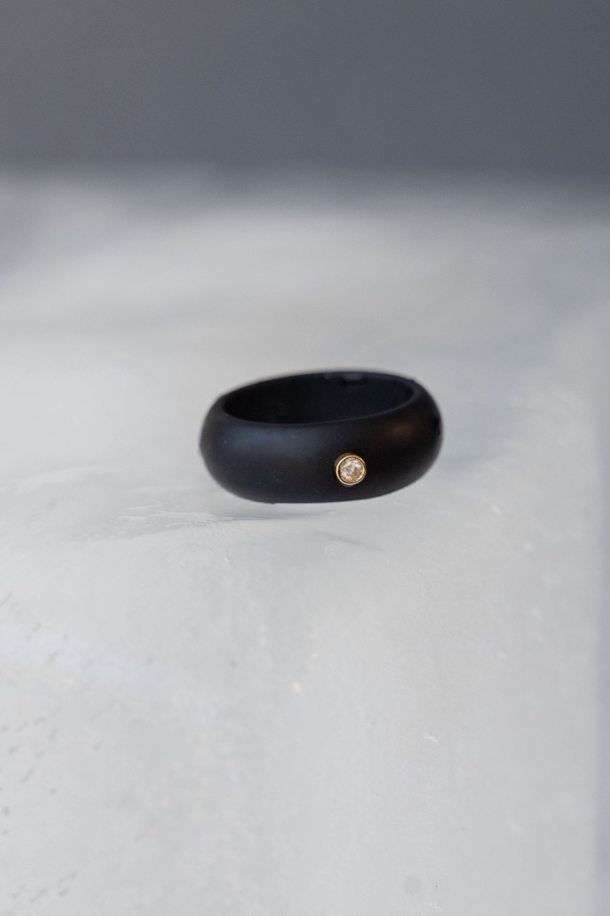Aro preto, confeccionado em material tecnológico resistente e flexível.